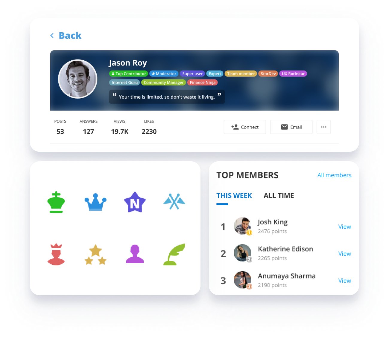 Motivate members to engage better through badges, reputation points and leaderboard.